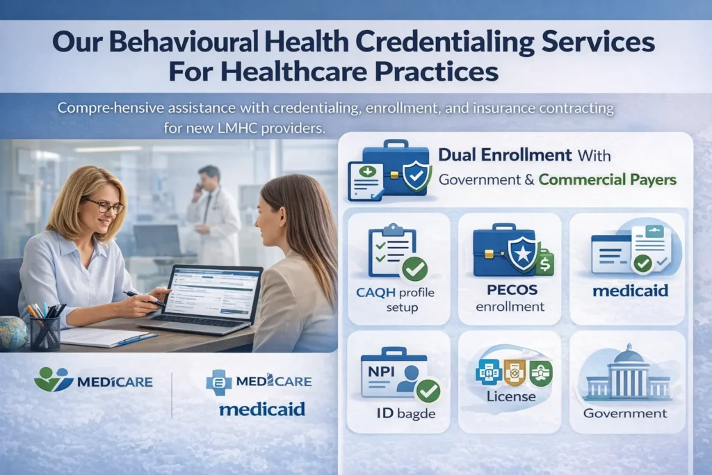 For new LMHC providers seeking credentialing support beyond billing, we provide comprehensive assistance with credentialing, enrollment, and insurance contracting. Our services include dual enrollment with both government and commercial payers, along with complete support to simplify and streamline the credentialing process.