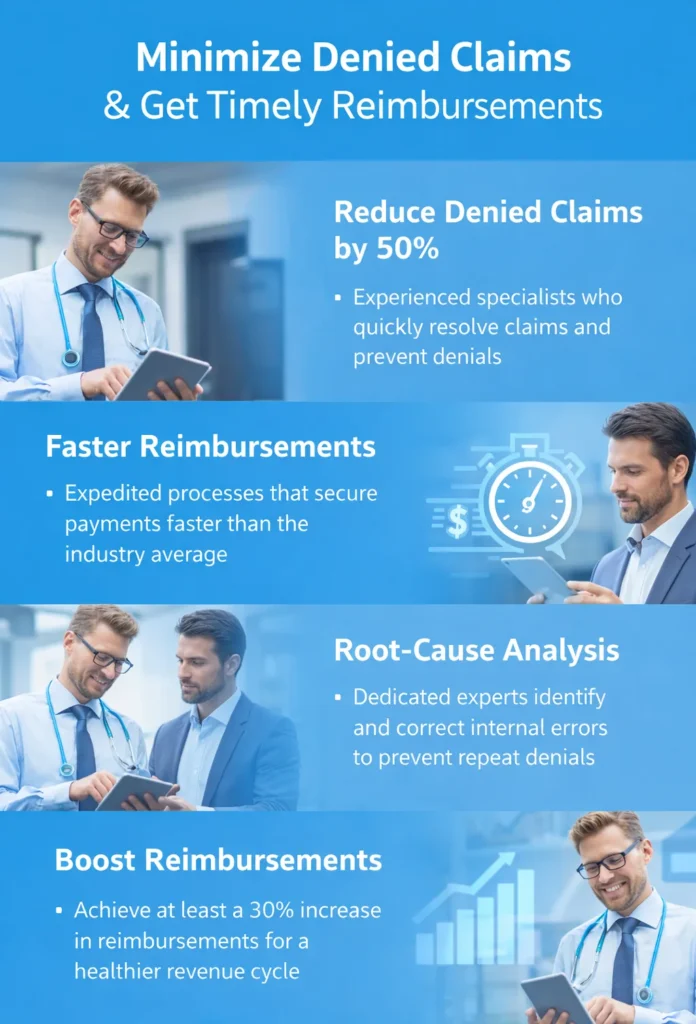 With experienced denial management specialists on your side, reimbursement timelines can be reduced by up to 50%—and that’s exactly what we strive to deliver. Our A/R denial management services in medical billing are streamlined, responsive, and results-driven. We correct internal inefficiencies, identify errors, and implement long-term solutions to prevent them from recurring.